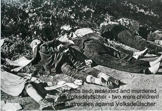 As can be seen in the photo, neither women nor children were spared by the Polish death squads. This is what the German army went into Poland to put an end to, after numerous appeals for peace were ignored, which revealed Jewry instigating such events that caused the war.
