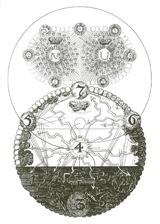 "The starting situation shows the residence of the divine trinity including the flames of the heavenly host. They are divided into the hierarchies of the archangels Michael [M] and Uriel [U]. The third and topmost is unoccupied, for its previous occupant, the representative of Jesus, has committed high treason by his willfulness. Lucifer ascends, driven downwards by his proud willfulness, but Michael and Uriel cast him down through the fire."