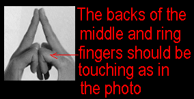 To open the base chakra, place your hands in the position shown in the photo, like the sign of the horns. Your finger pads should be touching and your thumbs should be touching side by side down to the fleshy part known in palmistry as the "Mount of Venus." This mudra produces a heat sensation in the hands and stimulates the base chakra. Don't worry if you cannot feel the heat sensation as this takes sensitivity. *PLEASE NOTE: THE HAND POSITIONS ARE OPTIONAL AND NOT MANDITORY. SOME OF THESE MUDRAS MAY BE DIFFICULT FOR THOSE WHO HAVE LARGER HANDS. IF THIS IS THE CASE, JUST SKIP THEM. THEY ARE NOT NECESSARY.